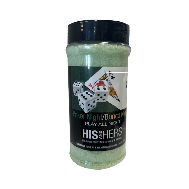 Spazazz HIS AND HERS: Poker Night/Bunco Night (Play all night) is spa-safe and oil-free, containing a mixture of sensual aromas and moisturizing botanicals to help smooth skin as well as soothe aches and pains.
