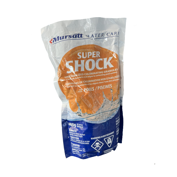 Mursatt Super Shock is a powerful, unstabilized chlorinating treatment designed to kill bacteria, control algae, and quickly restore pool clarity. Its granular formula dissolves rapidly and provides a high chlorine boost without adding stabilizer, making it ideal for pool opening, routine maintenance, or correcting imbalanced water.